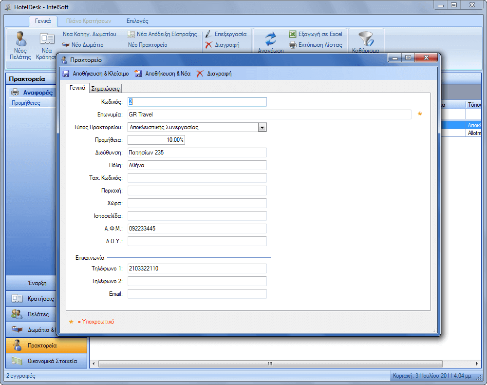 - Καταχώρηση των πρακτορείων με τα οποία συνεργάζεστε. Στα στοιχεία του πρακτορείου μπορείτε να εισάγετε το ποσοστό προμήθειας.