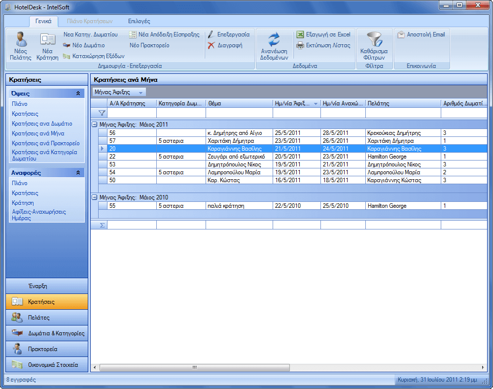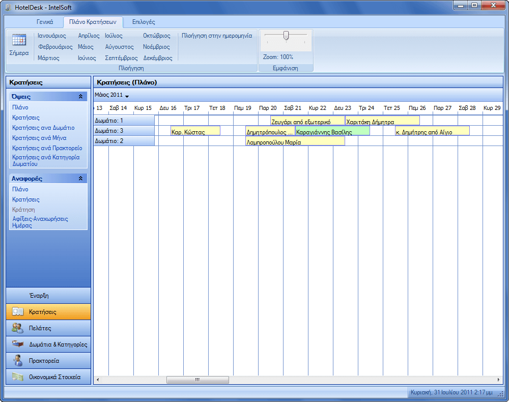 - Οι κρατήσεις εμφανίζονται σε πλάνο κρατήσεων καθώς και σε λίστα ανά ημερομηνία, μήνα, πελάτη και πρακτορείο.