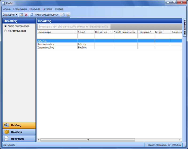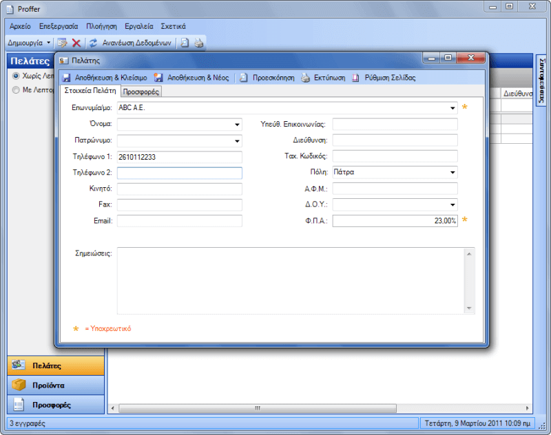 - Να καταχωρήσετε τους πελάτες σας συμπληρώνοντας στοιχεία όπως ονοματεπώνυμο, πατρώνυμο, επωνυμία, κινητό τηλέφωνο, email, ταχυδρομική διεύθυνση και πολλά άλλα.