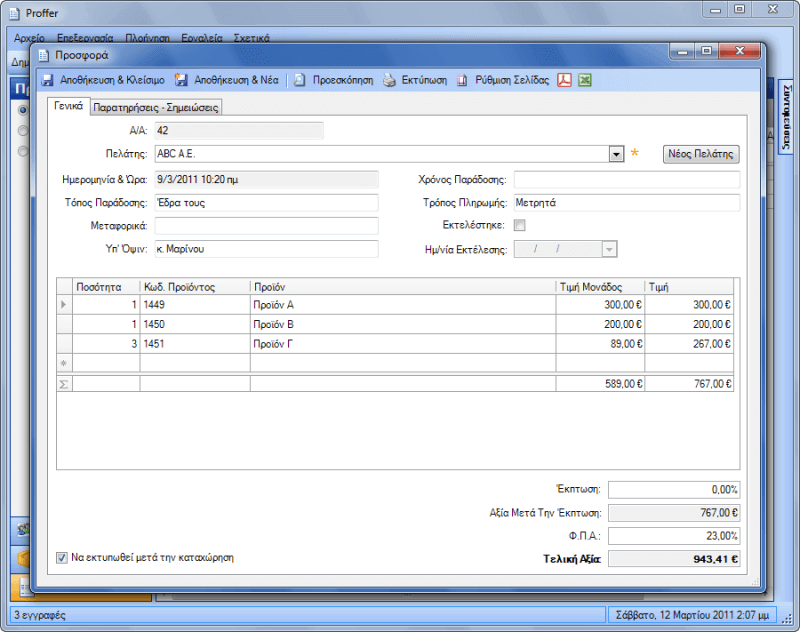 - Να καταχωρήσετε τις προσφορές συμπληρώνοντας μια μεγάλη πληθώρα από στοιχεία όπως πελάτη, ημερομηνία, τόπο παράδοσης, τρόπο πληρωμής, έκπτωση, παρατηρήσεις και πολλά άλλα.